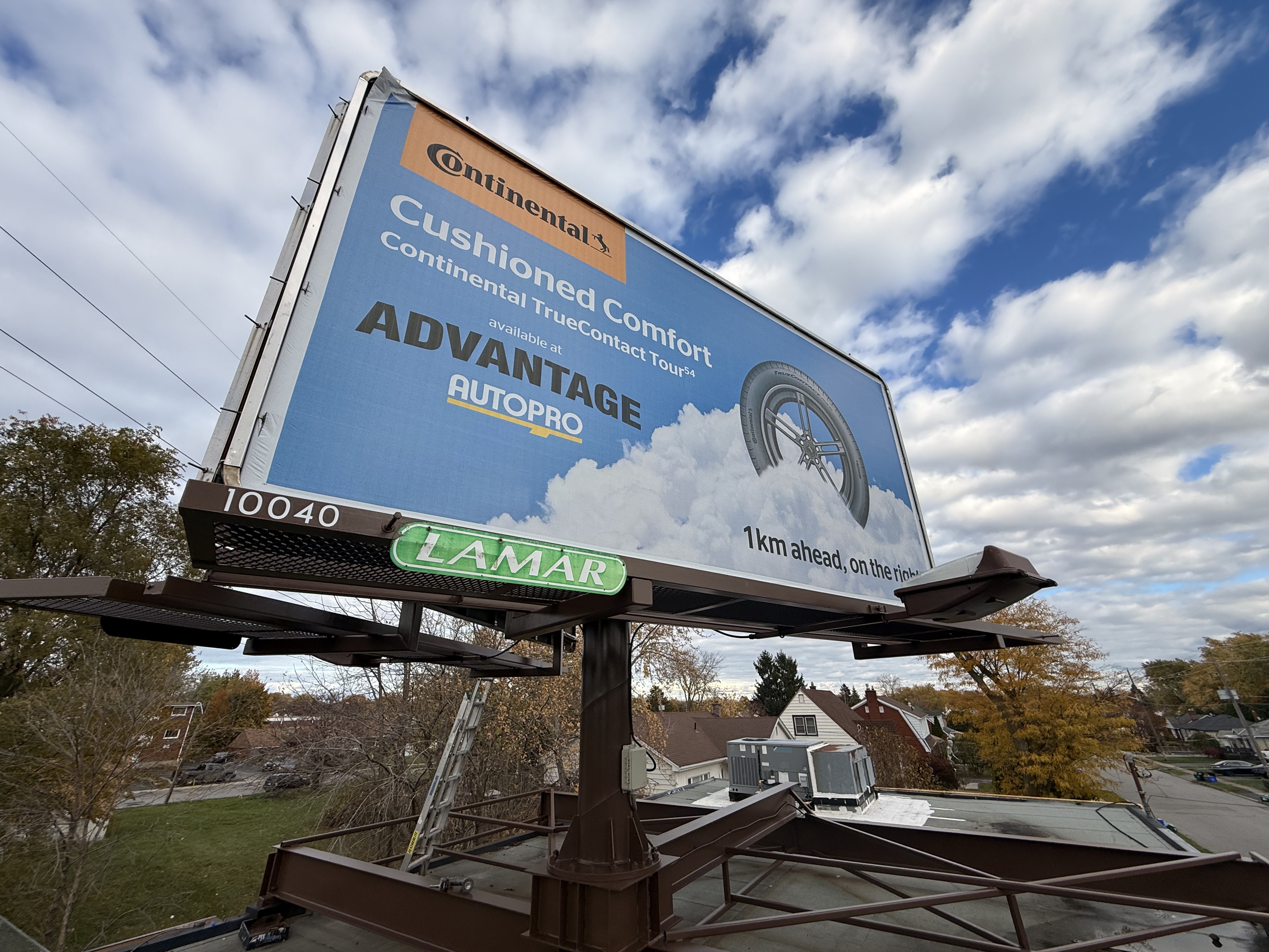 Lamar Exterior Billboards Niagara Falls, Ontario × Exterior billboard on the roof of Stanley Cloud 9 Vape shop. Grinding of rusted steel, spot priming of rusted areas with rust blocker and top coating with PPG Pitt-Tech Plus Gloss in specked Lamar Brown.